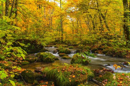 Clear Oirase Mountain Stream flow through the forest of colorful foliage of autumn season at Oirase Valley in Towada Hachimantai National Park, Japan.