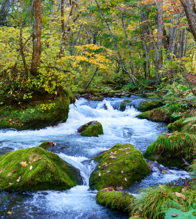 Oirase Stream in sunny day, beautiful fall foliage scene in autumn colors. Flowing river, mossy rocks and waterfall in Towada Hachimantai National Park, Aomori, Japan.