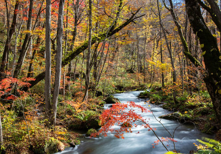 View of Oirase River flow along the Oirase Walking Trail passing the colorful forest of autumn season at Oirase Gorge in Towada Hachimantai National Park, Aomori Prefecture, Japan.