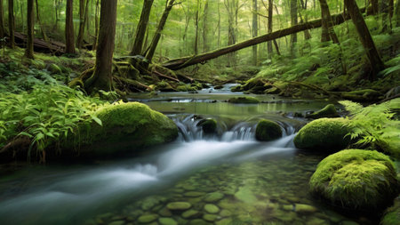 A trickling stream winds its way through the serene woodland, its gentle babbling accompanied by the soothing sounds of rustling leaves and chirping birds.. AI generated.