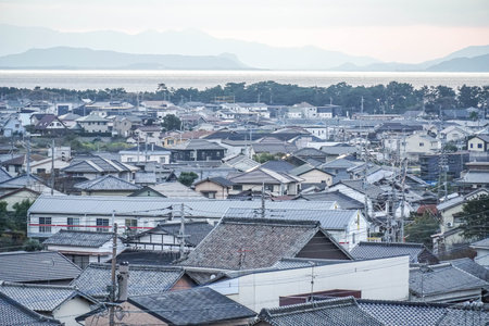Japan dense residential area houses roofs background. Japan real estate housing background