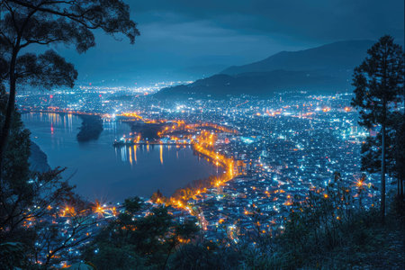 A serene night view of a river town illuminated by warm lights, capturing the peaceful atmosphere. The reflection on the water enhances the beauty of this tranquil landscape.
