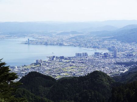 Landscape view of top Mount Inasa in sunny day with Nagasaki city and blue sky and mountain