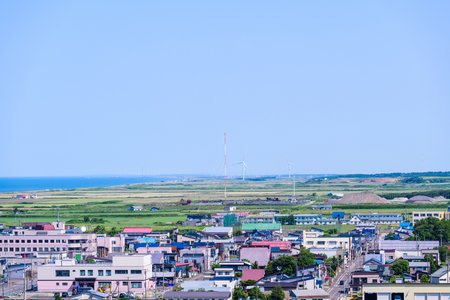 A summer panoramic view from the Fujimigaoka Park Observatory in Enbetsu Town, Teshio District, Hokkaido. Under the clear blue sky, the quiet townscape spreads out before you, the