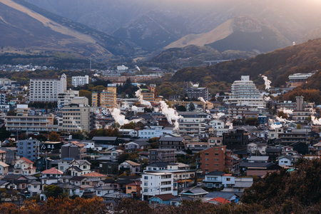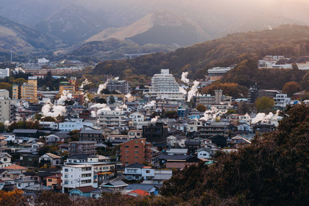 Beppu, Japan, city panorama skyline, Kannawa onsen distict, Oita prefecture, Kyushu island region,, Yukemuri observation deck, rising hot steam from onsen ryokan bath houses, Beppu resort hot springs