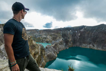 Man sitting at the volcano rim and watching the Kelimutu volcanic crater lakes in Moni, Flores, Indonesia. Man is relaxed and calm, enjoying the view on lake shining with many shades of turquoise