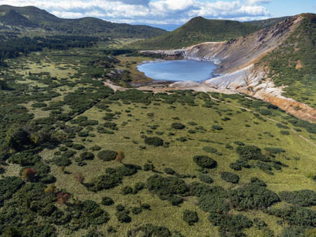 Panoramic image of the Boiling lake in caldera of Golovnin volcano on Kunashir Island, Kuril Islands, Russia. aerial view.