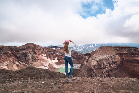 Young woman hiking to the top of the volcano. Kamchatka peninsula, Russia