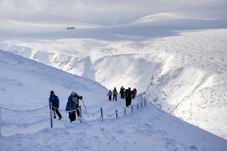KARPACZ, POLAND - MARCH 08, 2020: Tourist trail to Sniezka (mountain on the border between the Czech Republic and Poland). Winter landscape. Giant Mountains, Poland, Europe.