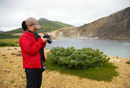 Girl with foto in Kalidere vulcan Golovnina, lake Boiling. Kurily,island Kunashir
