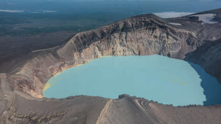 An amazing lifeless acid lake in the crater of an extinct volcano. Steep rocky slopes. Sulfur deposits are visible on the turquoise water. View from a height. Kamchatka