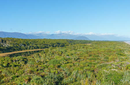 Scenic west coast view over natural wetland or swamp vegetation at Ship Creek looking to distant Southern Alps and horizon.South Island New Zealand.
