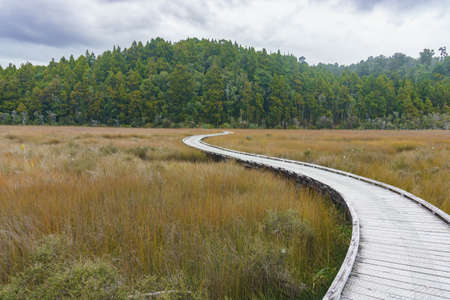Wooden walkway winding through wetland reed towards native bush at Okarito, South Island New Zealand.