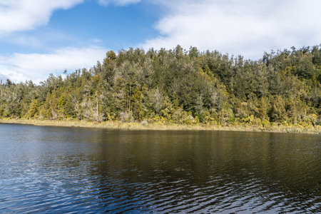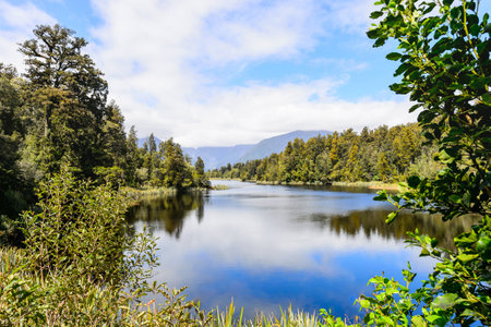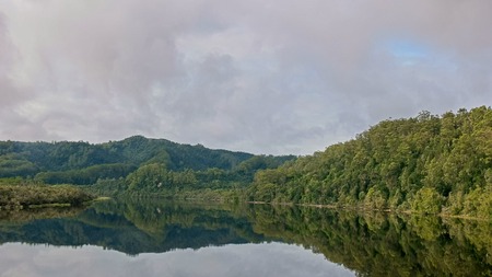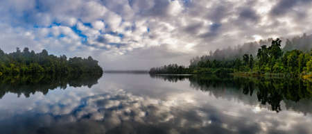 Cloud reflections on a misty morning of a bush and forest lined Lake Mapourika in West Coast New Zealand