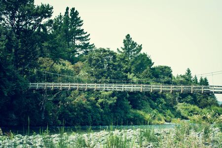 Retro style photo of suspension bridge across Tongariro river. Turangi, New Zealand. Toned image