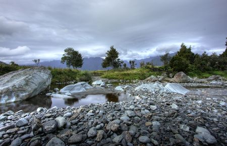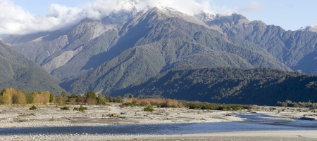 Beautiful panorama of the Haast river on a cloudy day, New Zealand