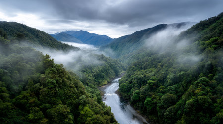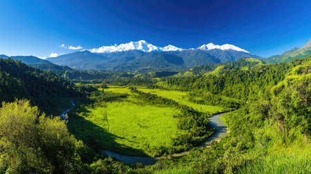 A breathtaking view of a serene mountain landscape featuring a winding river and a lush green valley under a clear blue sky, capturing nature's beauty.