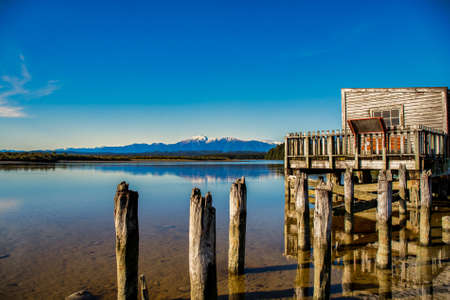 The historic wooden Boathouse on the shore of Lake Okarito with the Southern alps in the background