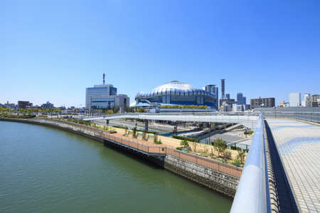 View of Osaka cityscape with Yodo River embankment and skyscrapers, Osaka prefecture, Japan, in a sunny day with a blue sky, streets of Osaka downtown center, travel to Japan