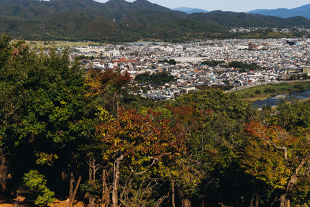 view of Kisogawa river and Inuyama cityscape in japan. Midday and clear sky. in Autumn Season.