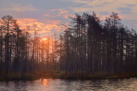 Sunset in the bog, golden marsh, lakes and nature environment. Sundown evening light in summer