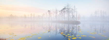 Сrystal clear lake (bog) in a fog at sunrise. Symmetry reflections on the water, natural mirror, dark tree silhouettes. Epic cloudscape. Idyllic autumn scene. Concept art, fantasy, fairy tale
