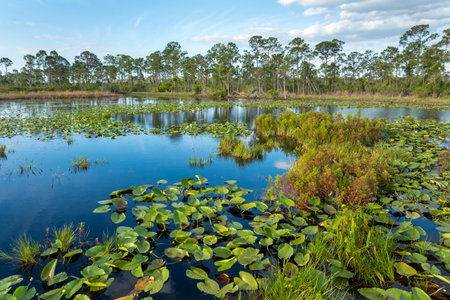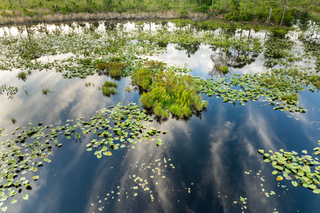 Sunny landscape of Florida wetland flora. Lily pads flowers on forest lake water in southern tropical swamp