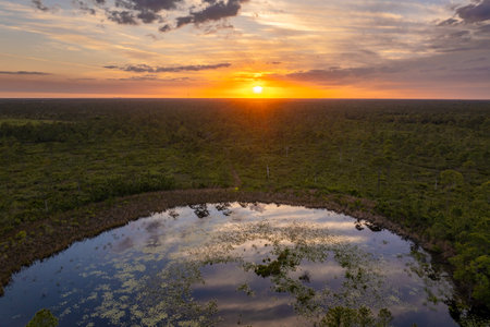 Sunset over lake in wetland forest in Florida. Tropical nature in southern climate