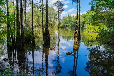 Mysterious reflections in a cypress swamp with still water surrounded by trees