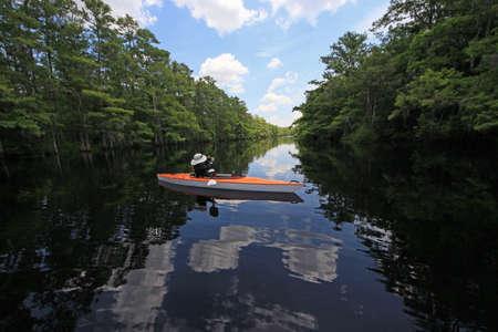 Female kayaker on Fisheating Creek, Florida on calm early summer afternoon amidst clouds and Cypress Trees reflected on creek.