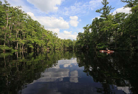 Fisheating Creek, Florida on calm early summer afternoon with perfect reflections of Cypress Trees and clouds on tranquil water.