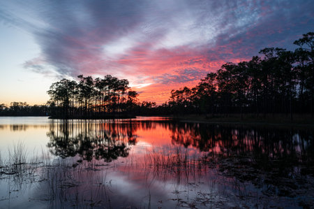 Colorful sunset cloudscape over Long Pine Key in Everglades National Park, Florida reflected in calm water of lake.