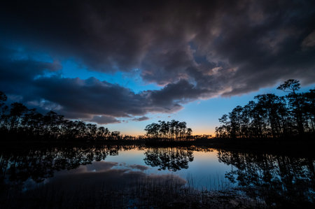 Colorful stormy sunset cloudscape reflected in calm water of Long Pine Key in Everglades National Park, Florida.