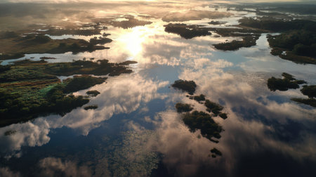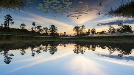 reflection of sky and clouds in wetland waters, created with generative ai