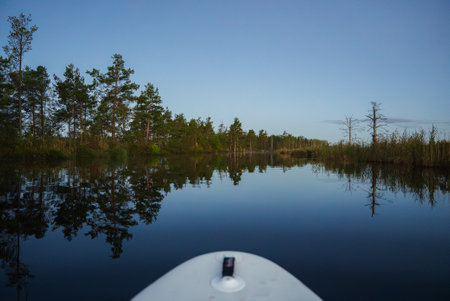 Crystal clear lake (bog) in evergreen forest at sunrise. Pine trees close-up. Latvia. Clear blue sky, colorful clouds, reflections in a still water. Natural mirror. Golden hour. Panoramic view