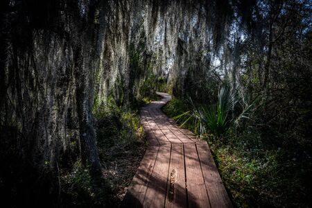 Walking Through Spanish Moss on wooden boardwalk