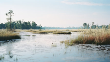 marshland on the border of a pond and woods, captured in the style of taylor wessing and sudersan pattnaik. this photo showcases serene maritime themes, reminiscent of documentary travel photography. the color palette features light aquamarine and beige tones, reminiscent of the works of elisabeth sonrel. shot with a rollei prego 90 camera. ai generated