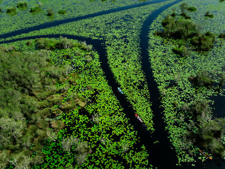 tourist kayaking in lake or wetland nature of lotus swamp at Rayong botanic garden, aerial top view from drone.