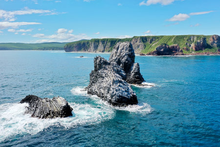 Beautiful summer landscape of Kamchatka - Three Brothers Rocks in Avacha Bay and cone of Volcano. Russian Far East