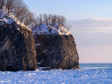 Seascape with a snow-covered beach on a rock background. The promenade in the Transparent Bay at the Ritsa beach.Nakhodka, Russia