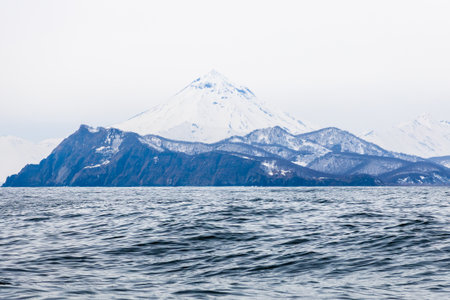 view of Babya bay mountain coast in Pacific ocean on spring day near Petropavlovsk-Kamchatsky city, Kamchatka Krai, Russia