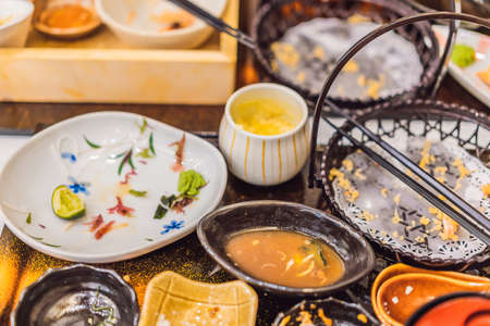 Seafood traditional Japanese cuisine for dinner at local restaurant.