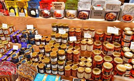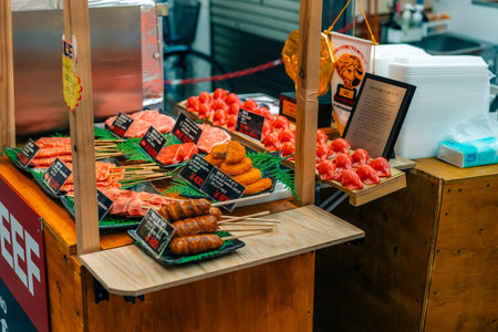 Kyoto, Japan- 26 Nov, 2019: Snack sold in the of Nishiki market, is an indoor shopping street located in the center of Kyoto city in Japan.