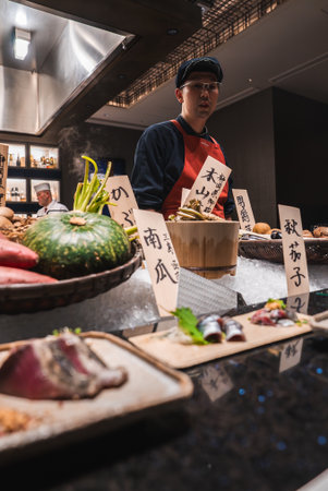 Japanese chef prepares omakase at luxury hotel restaurant in Japan
