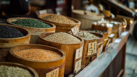 An assortment of grains and seeds, including lentils and beans, beautifully displayed in wooden barrels at a market, highlighting natural, organic produce.