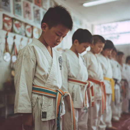 Young boys in karate uniforms standing in a line, bowing with reverence during a disciplined training session, learning respect and focus in a martial arts class