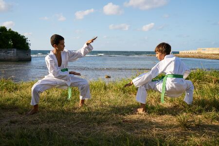Children doing combat and extreme sports. Latino boys exercising in karate and traditional martial arts. Simulation of fight on the beach