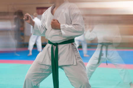 Karate-do training for teenagers. An athlete in a white kimano with a green belt demonstrates karate techniques. Retro styled processing. Added motion blur for more dynamics.