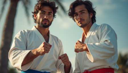 Karateka and sensei bowing in dojo warm colors respectful posture engaging karate scene