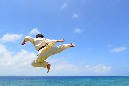 Karate man in an old kimono and black belt training side kick at the sea. Martial arts concept. The river flows into the sea at the background.